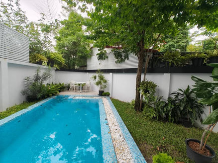 Maison Blanche (Pool Villa) Sukhumvit 67, located right next to BTS Phra Khanong, offers more value than living in a condo. This brand-new, never-occupied, 3-story single house sits on 61.8 square wahs of land and boasts 412 square meters of living space. It features 5 bedrooms, 6 bathrooms, 3 parking spaces, 1 maid's room, a private swimming pool, and an in-house elevator.